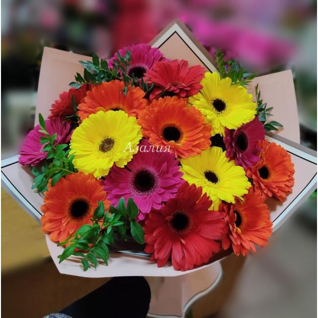 Букет из 15 разноцветных гербер