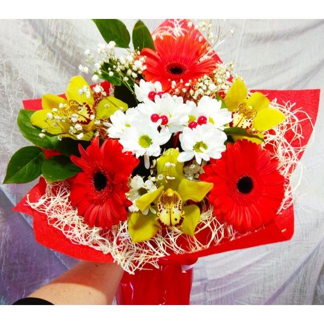 Красные герберы прекрасно дополняются зелёными орхидеями, а декоративные ягодки очень освежают хризантему
