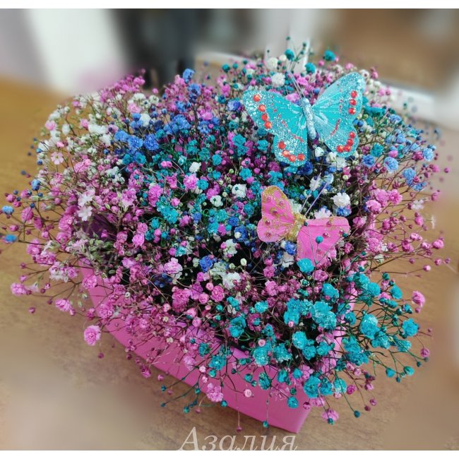Коробочка сердце с радужной гипсофилой и бабочками