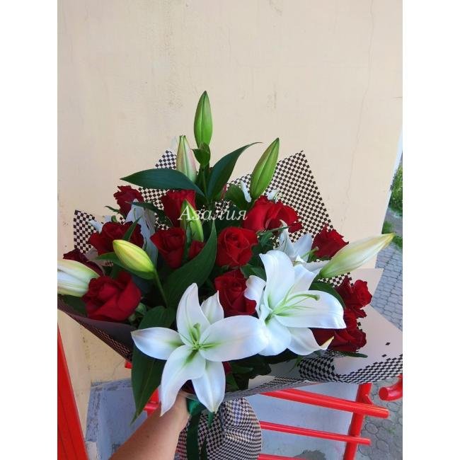 Белоснежные лилии в окружении классических бордовых роз