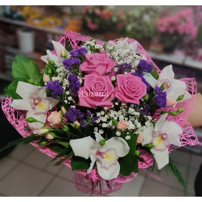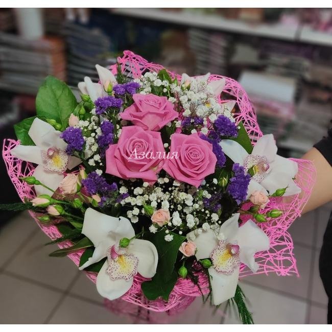Белоснежные орхидеи и нежные кустовые розочки прекрасно дополняют розовые розы