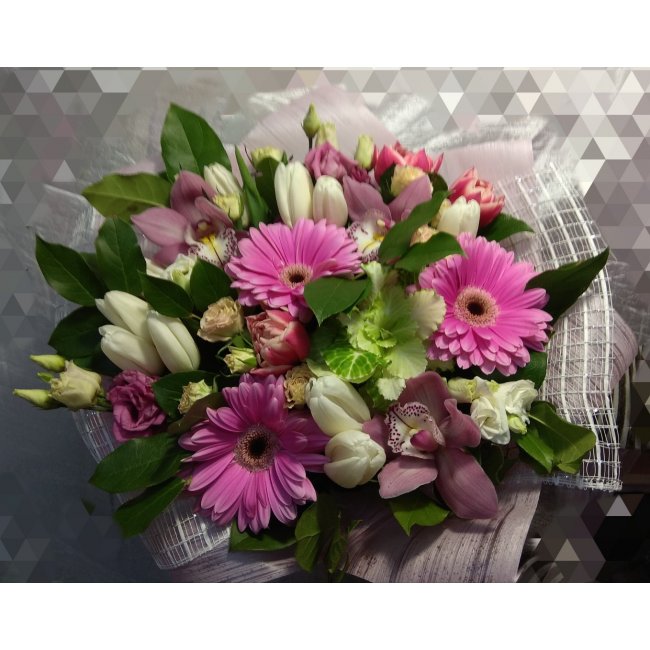 Герберы, кустовые розы, эустомы, тюльпаны и орхидеи