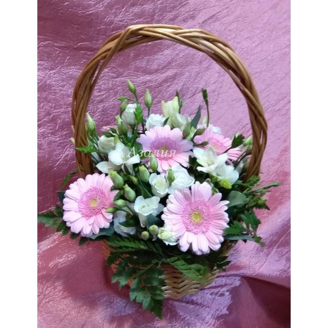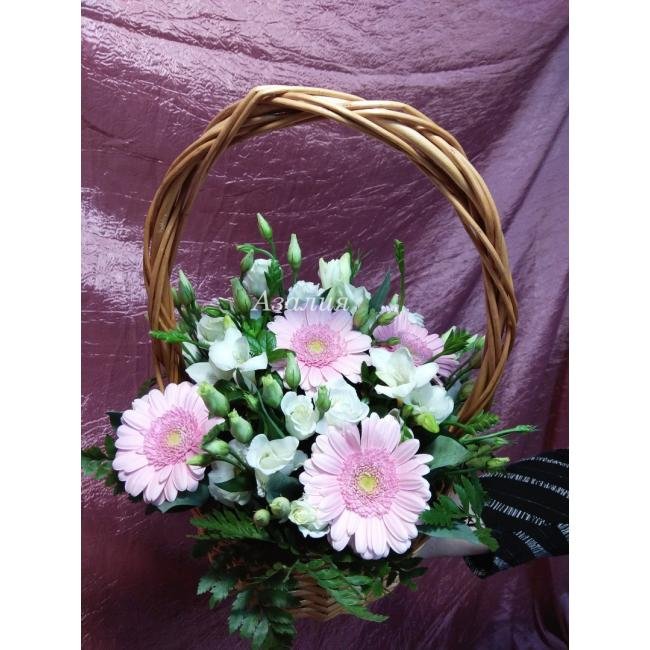 Красивая корзина с букетом из свежих цветов станет отличным подарком к любому торжеству