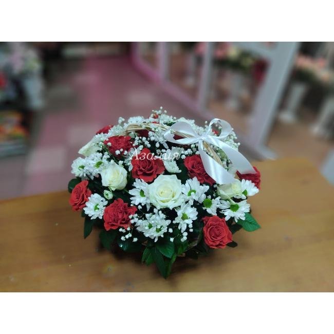 Милые хризантемы-ромашки и эффектные розы в плетеной корзинке