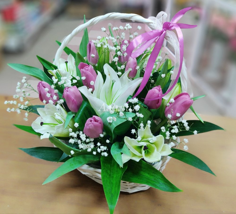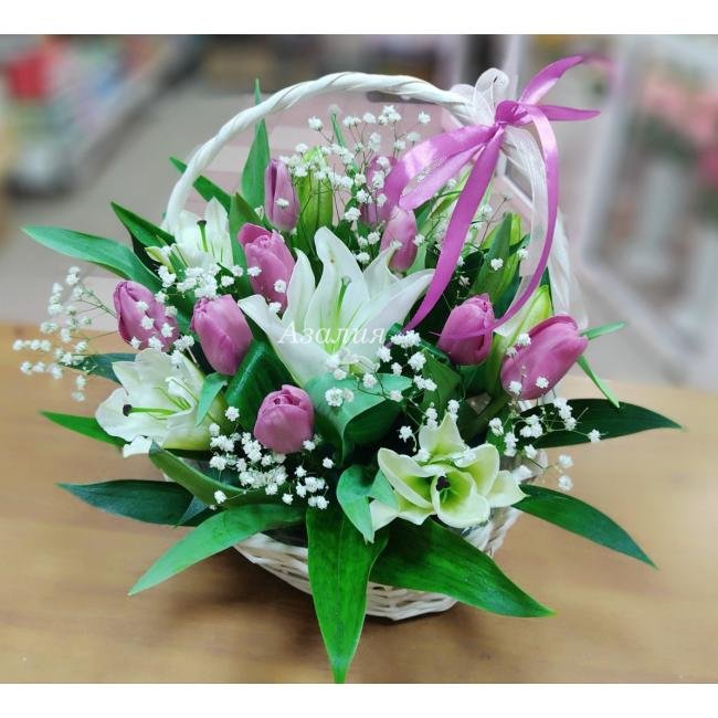 Нежно и ароматно от такой корзиночки. Тюльпаны и лилии, цвет уточняйте у менеджера